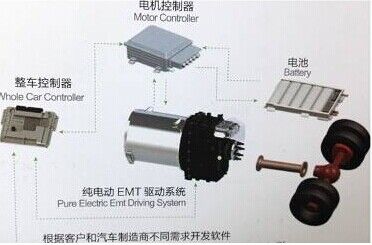 動(dòng)力總成采用電驅(qū)動(dòng)機(jī)械式自動(dòng)變速器,采用四檔自動(dòng)變速傳動(dòng),無離合器,無機(jī)械式同步器,利用電驅(qū)動(dòng)主動(dòng)同步代替?zhèn)鹘y(tǒng)的同步器摩擦被動(dòng)同步,純EMT相比傳統(tǒng)自動(dòng)變速器AMT具有高效率和低成本優(yōu)勢。