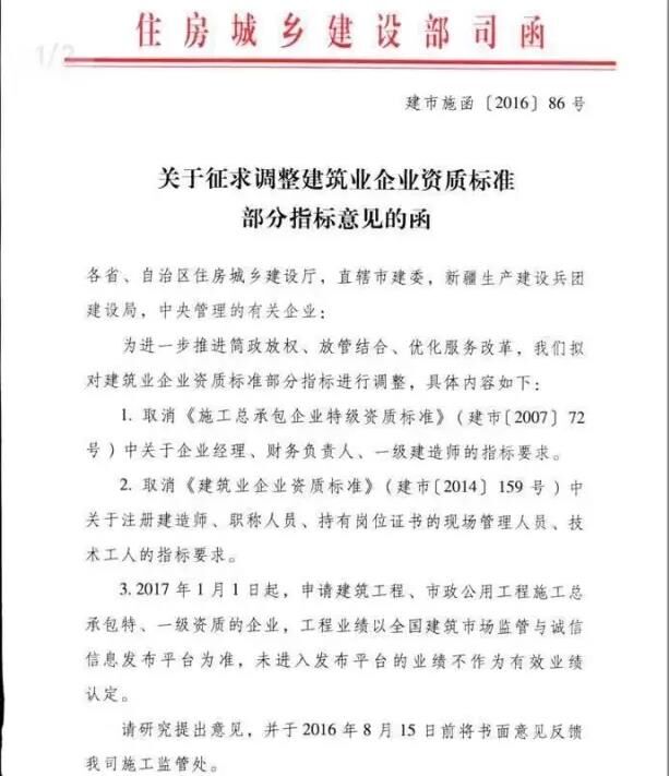 近日,住房和城鄉(xiāng)建設部建筑市場監(jiān)管司就“調整建筑業(yè)企業(yè)資質標準部分指標”征求意見(建市施函[2016]86號),主要內容有以下兩點:
